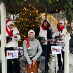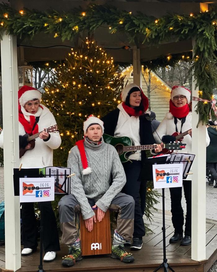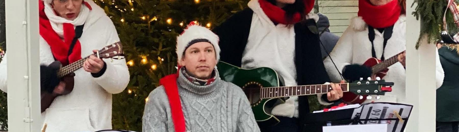 Hyvän mielen ukulele-bändi esiintyy soittaen ja laulaen jouluista musiikkia. Esiintyminen tapahtumapihan paviljongissa.