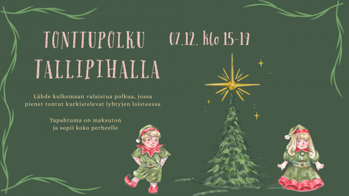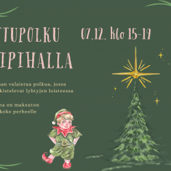 Lähde kulkemaan valaistua polkua, jossa pienet tontut kurkistelevat lyhtyjen loisteessa. Tapahtuma onnmaksuton ja sopii koko perheelle. Polun päätteeksi luvassa arpajaiset ja joulun tunnelmaa. Polku lähtee kahvilan terassin läheisyydestä.