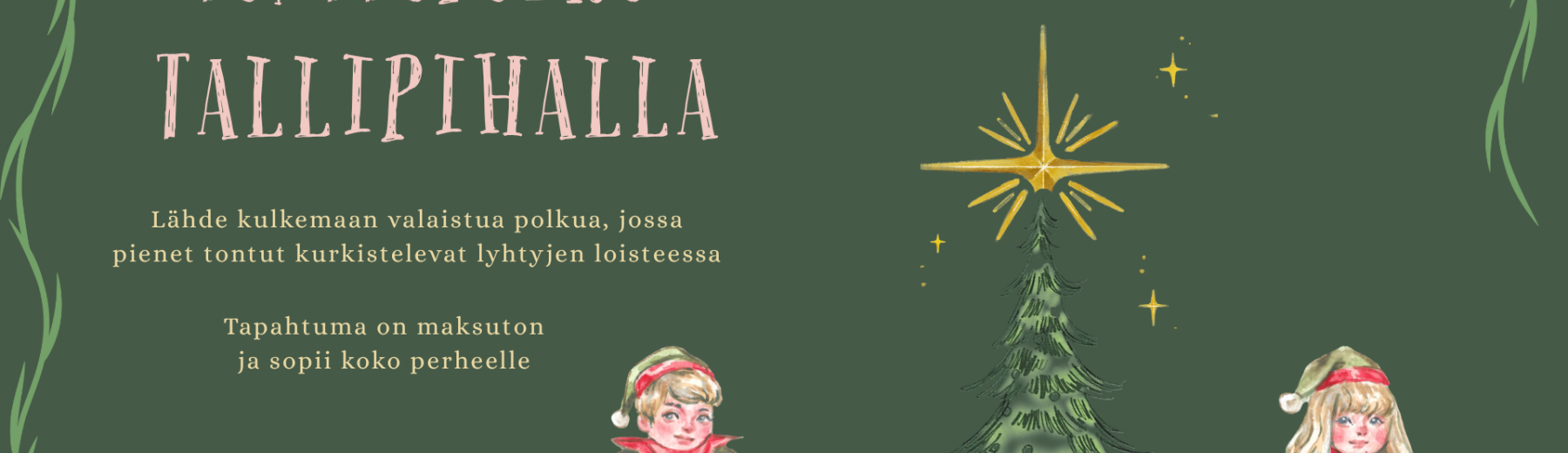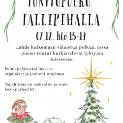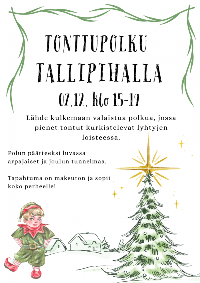 Lähde kulkemaan valaistua polkua, jossa pienet tontut kurkistelevat lyhtyjen loisteessa. Tapahtuma onnmaksuton ja sopii koko perheelle. Polun päätteeksi luvassa arpajaiset ja joulun tunnelmaa. Polku lähtee kahvilan terassin läheisyydestä.